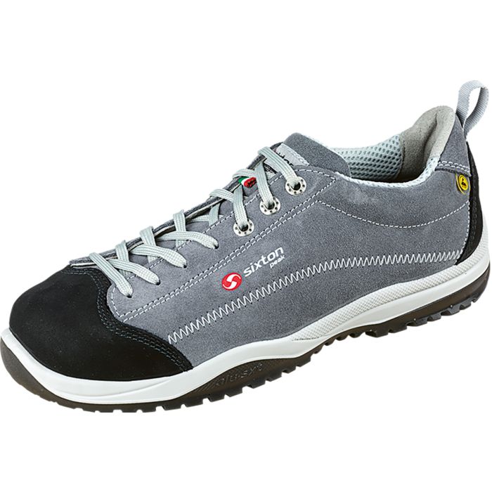 Die Sicherheitsschuhe S3 ESD Sixton Pasitos bestehen aus grauem Nubukleder. Das Material ist abriebfest und für den täglichen Einsatz geeignet. Es ist nicht perforiert. Dadurch bleibt der Schaft stabil und widerstandsfähig gegen äußere Einflüsse. Ein Textilfutter sorgt für ein ausgeglichenes Innenklima. Der Schaftrand ist weich gepolstert. Dadurch entsteht ein sicherer und angenehmer Sitz. Die Staublasche ist ebenfalls gepolstert. Sie reduziert den Druck im Ristbereich. Eine Aluminiumkappe schützt den Vorderfuß. Die Kappe ist leicht, korrosionsfrei und nicht magnetisch. Dadurch eignet sie sich auch für Arbeitsplätze mit Metalldetektoren.